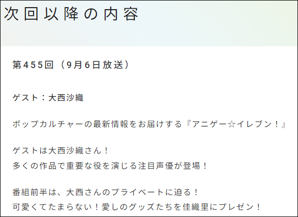 前田佳織里さんがMCを務めるエンタメ総合情報番組「アニゲー☆イレブン!」の、9月6日放送分に大西さんがゲスト出演されることが発表されました。